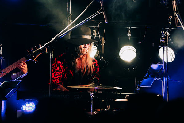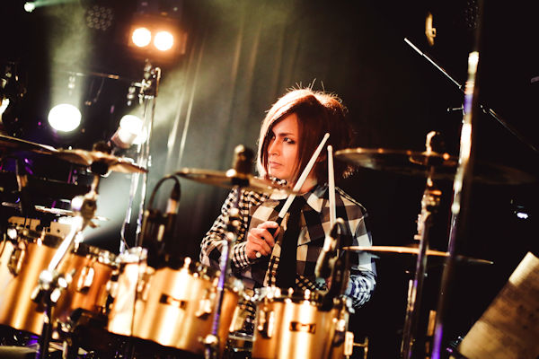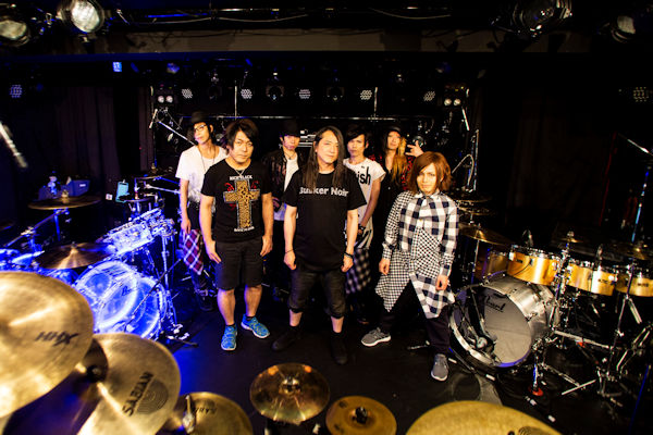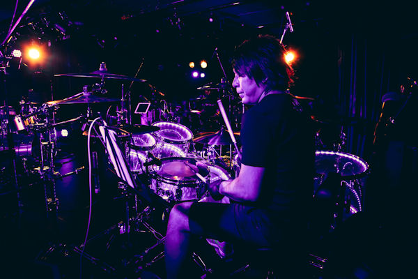 そんな情熱的なオープニングのあとはマイクを取り、「Busker Noir」の趣旨と、今回大阪では初開催になることを落ち着いた雰囲気でゆったり話すSakura。普段のバンドのライブではメインでMCをすることがあまりない彼の進行で進む感じも貴重な体験だ。さらに今夜を彩るゲストミュージシャンにSORA(vocal/ex.INO HEAD PARK)、YOSHIHIRO(Guitar/ギルド)、田浪真悟(Bass/Z’s)、荒井かずみ(Keyboard)を呼び込むと、舞台はドラム3台がゲストミュージシャンを囲むスタイルに。