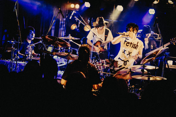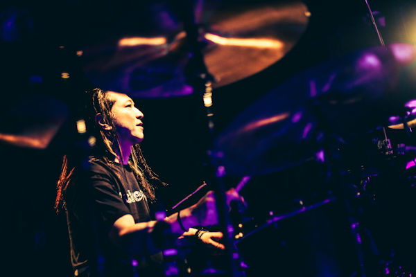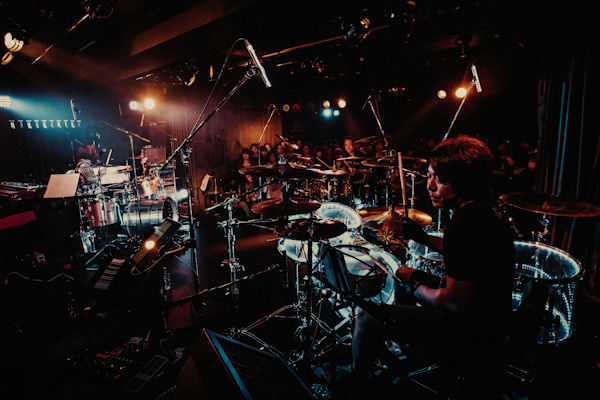 次のコーナーは「それぞれのドラムのアプローチの違いを楽しむ」ということでまずじゃんけんで順番が決められる。3人ともが自分の好きな曲をアレンジして叩くという企画で一番手となったshujiは最近テレビで偶然聴いてかっこよかったという「時代」をアレンジ。「実はあんまりドラム入ってないんやけど(笑)」と言いながらも照明も相まってアダルトで大人なアレンジのアプローチは新鮮だ。