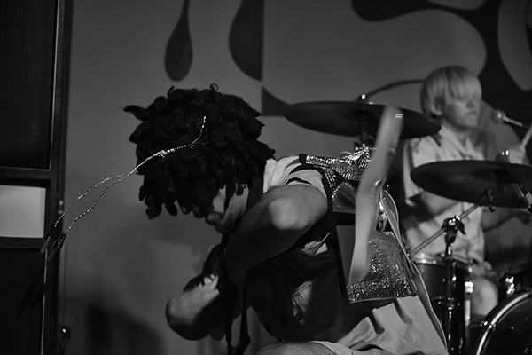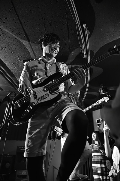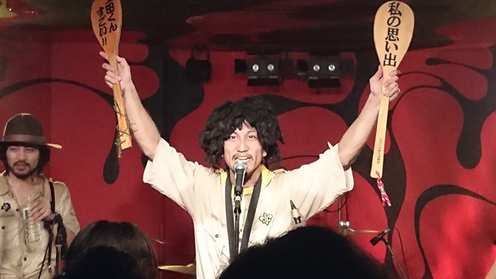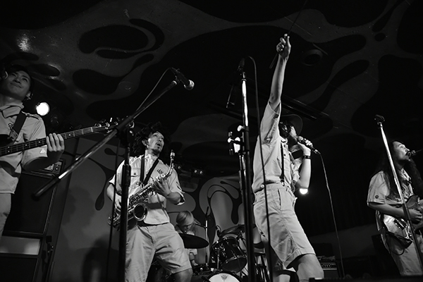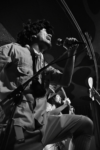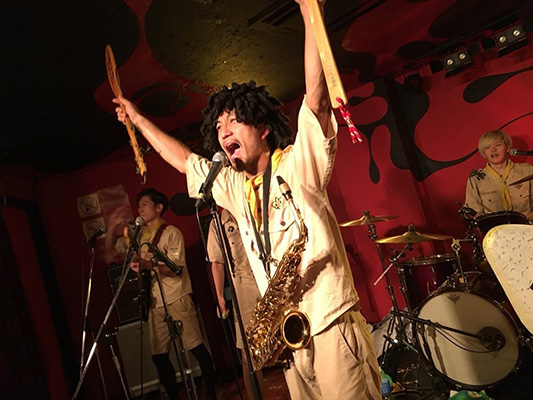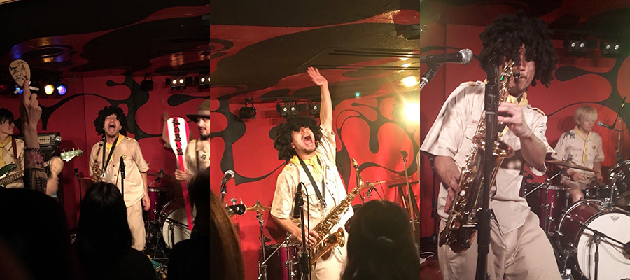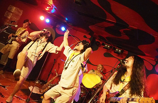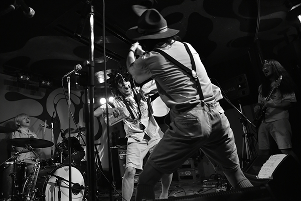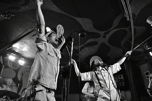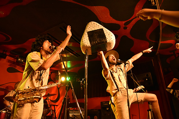 そして9月に発売されたニューアルバム『ワンダフル毎日』の中から「虫とり」を披露。虫取り網を振り回して繰り広げられる寸劇(!?)も魅力のポップチューンだ。続いて「イモイモホリホリイモホリホリ」という歌詞をひたすら唱える5曲目「イモほり」。好きな天ぷらはどれ?とフロアに問いかける6曲目「えび天」は、途中でエレガントなドラマー中居貴族が料理長に扮するのだが、この日は、無事“かきあげ”が揚がりフィニッシュを決めた。