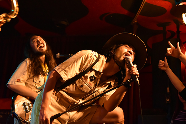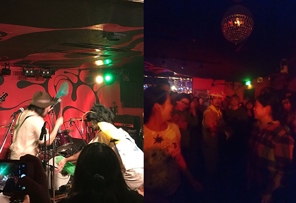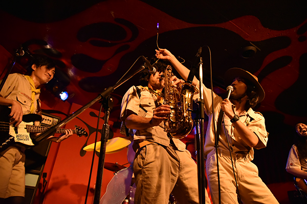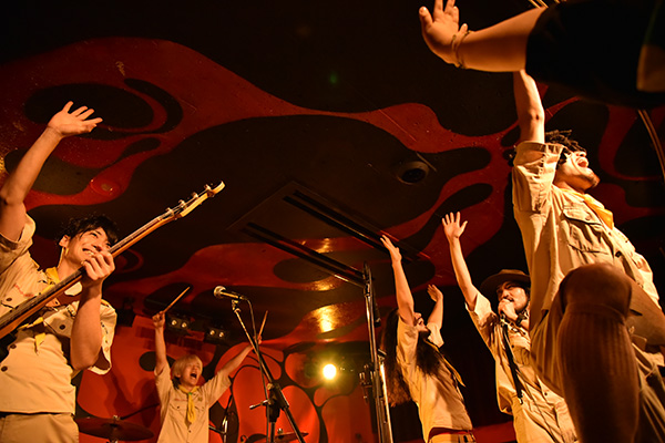 インディー・ジョーンズのテーマが流れる中、メンバーがフロア後方から来場者をかき分けながら(探検しているかの様子)ステージに到着。隊長・登山が「無事U.F.O.CLUBにたどりついたぜ~!!!よろしくアドベンチャー!!!」と絶叫すると、大歓声がわき起こった。