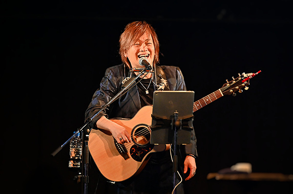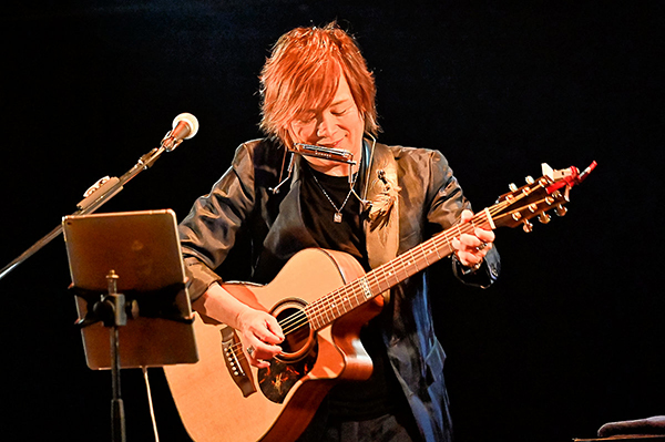 笑顔で登場する影山。暖かみのあるギターのアルペジオが待機中に感じた冬の寒さを忘れさせる。1曲目は「Over the rainbow 」で世界的に知られるJudy Garlandの「Have yourself a merry little christmas」Frank SinatraやElla Fitszgeraldらにもカヴァーされたスタンダードナンバーを、影山はギター1本で優しく歌い上げる。ブルースハープを身に着け一転して明るく元気の出るナンバーJAM Projectのセルフカヴァー「Little wing」へ。“今日はいっぱい来てくれて、Sold outという事で、ありがとう!”と影山は笑顔で謝意を伝える。