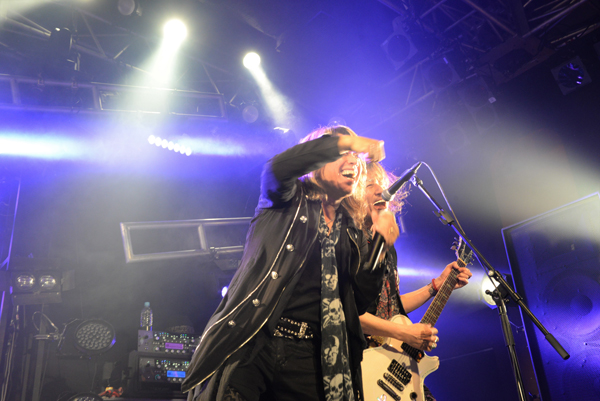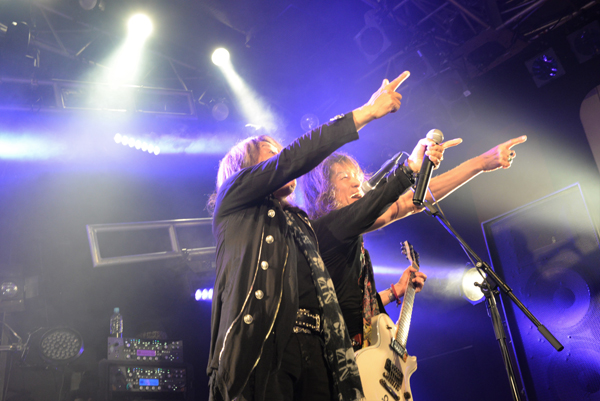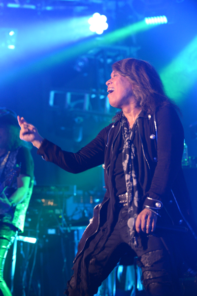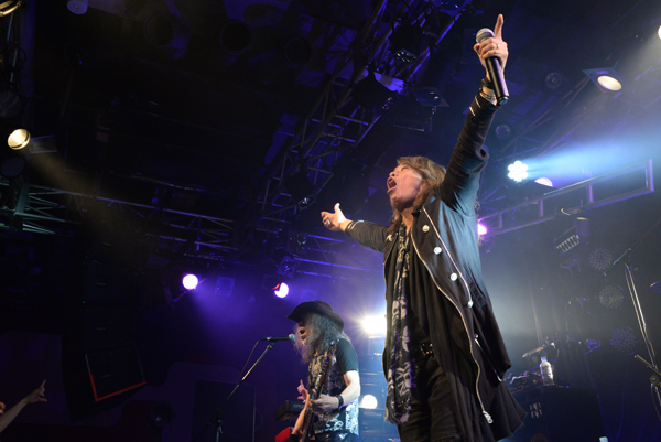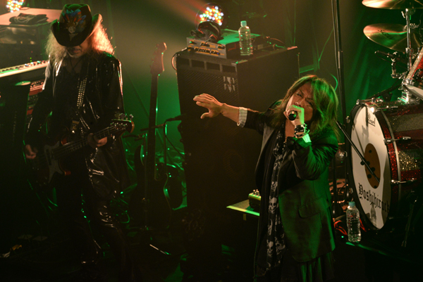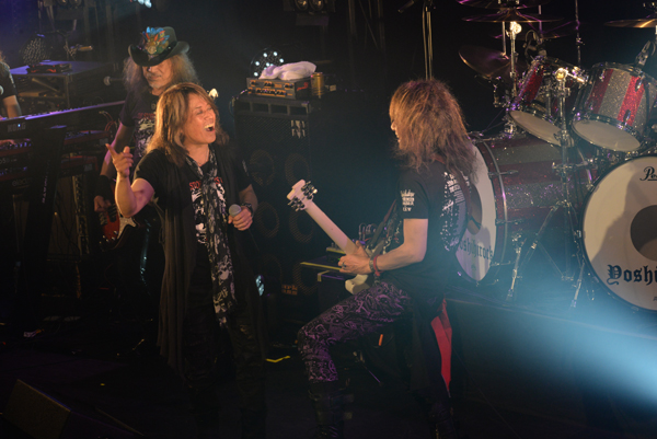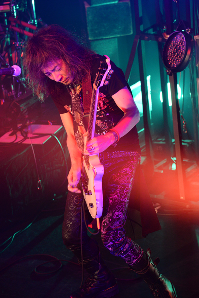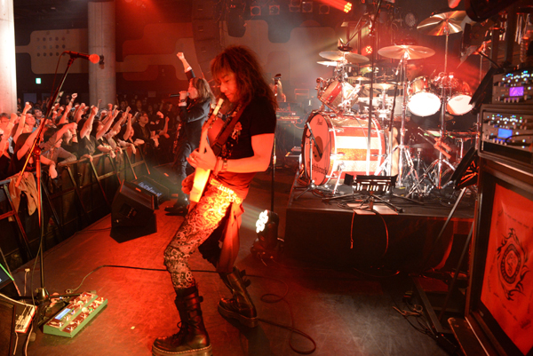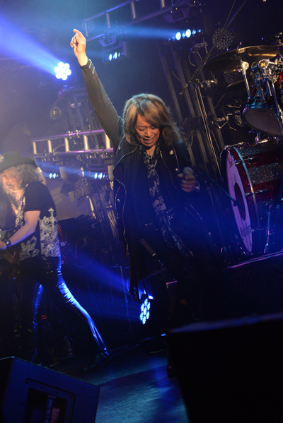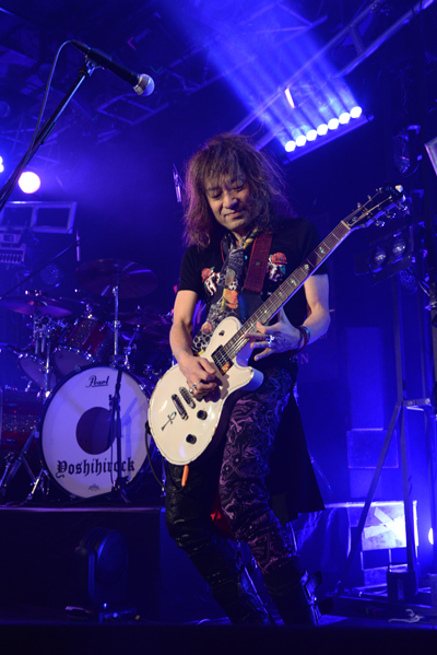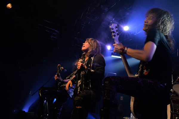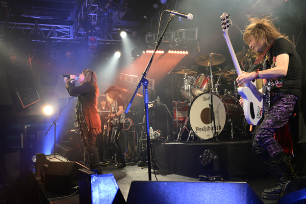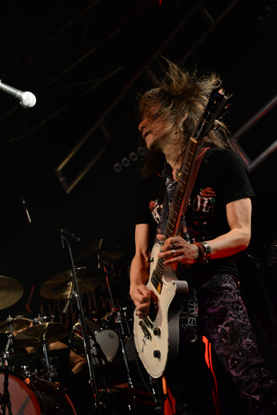 「そんな想いや夢を未来に繋げていこうぜ!」と、続いてもニューアルバムからの3曲続けての演奏だ。まずはキーボードのメロディアスなイントロから激しく展開する「DREAM OUT LOUD」。SHARAとTOSHIの各々のソロが終わった後のツインでのハモリがスリリングだ。