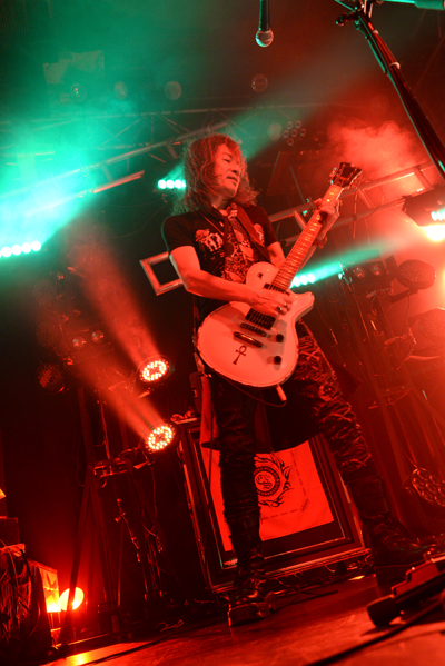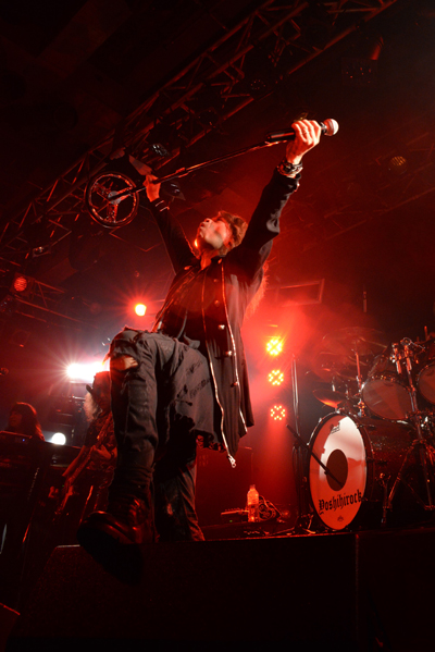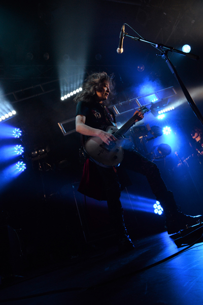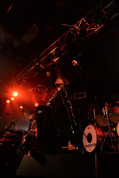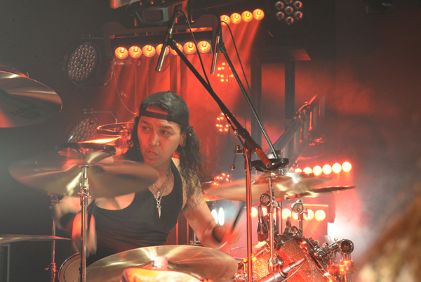 間髪入れずに「BRIGHT LIGHT AND SHADOW」が続く。KUDOの真骨頂であるツーバス連打が炸裂し、KAIのアグレッシブなプレイが全開だ。激しく且つメロディアスな曲調と相俟って、会場内は更にヒートアップしていく。
