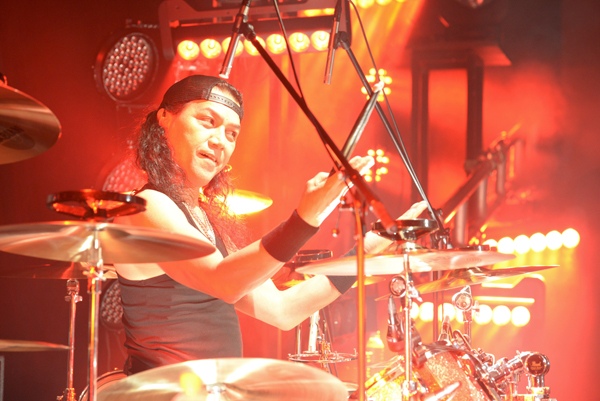 「OK!ドラムス KUDO YOSHIHIRO!」恒例のKUDOのドラムソロだ!いまやハードロックのライブでソロを演るドラマーも少なくなったように感じるが、EARTHSHAKERのライブではKUDOのソロは必要不可欠である。語弊のある言い方かも知れないが、KUDOには円熟味という言葉は似合わない。派手なアクションから叩き出された衰え知らずなドラム・サウンドは、本当に今年還暦か?と思うほどに、若々しくパワフルであることは誰もが認めることであろう。エンディングでは、立ち上がって「どうだ!?」と言わんばかりの自信に満ちた表情を見せるKUDOは頼もしい限りだ。そんなKUDOを「良かった!良かった!みんな盛り上がってくれてありがとう(笑)」といじりながら再入場してきたMARCYであるが、強烈なソロを披露したKUDOに感服する笑顔を見せている。