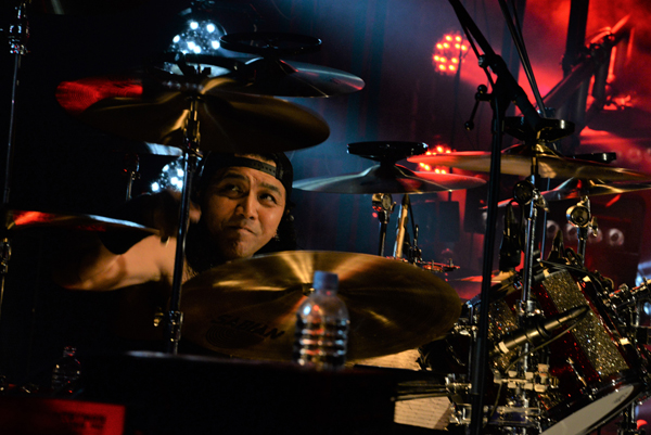 「TOSHIの音楽の世界がプラスとなってバンドに刺激を与えてくれた曲を披露したい」とニューアルバムからTOSHIが作曲した2曲のバラードナンバーの演奏だ。「みんなの笑顔がもっともっと溢れますように」と紹介された「星に願いを」が始まる。ギターソロ終わりのタイミングを見計らい、振り返って後方の鍵盤でピアノの音色の奏でるTOSHI。そして後奏では両手を広げて左右の鍵盤を弾くという佇まいは、名キーボーディストの面目躍如である。