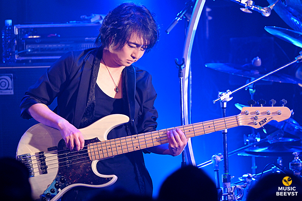 ライヴの中盤、YUHKI がALHAMBRAの第6のメンバーといっても過言ではないと紹介し、ゲストの佐々井 康雄(Vocals)が登場。ニューアルバムの「Mediterranean Sea」へ。佐々井 康雄の低音ヴォイスと、世良 純子の高音ヴォイスが、時に抱き合いながら螺旋を描いて上昇するかのような様が、ドラマティックで圧巻!の一言だ。そしてALHAMBRAの新メンバーとなった長谷川 淳の重厚なフレーズからメロディアスな高音域までを自在に行き来するベースソロへ。