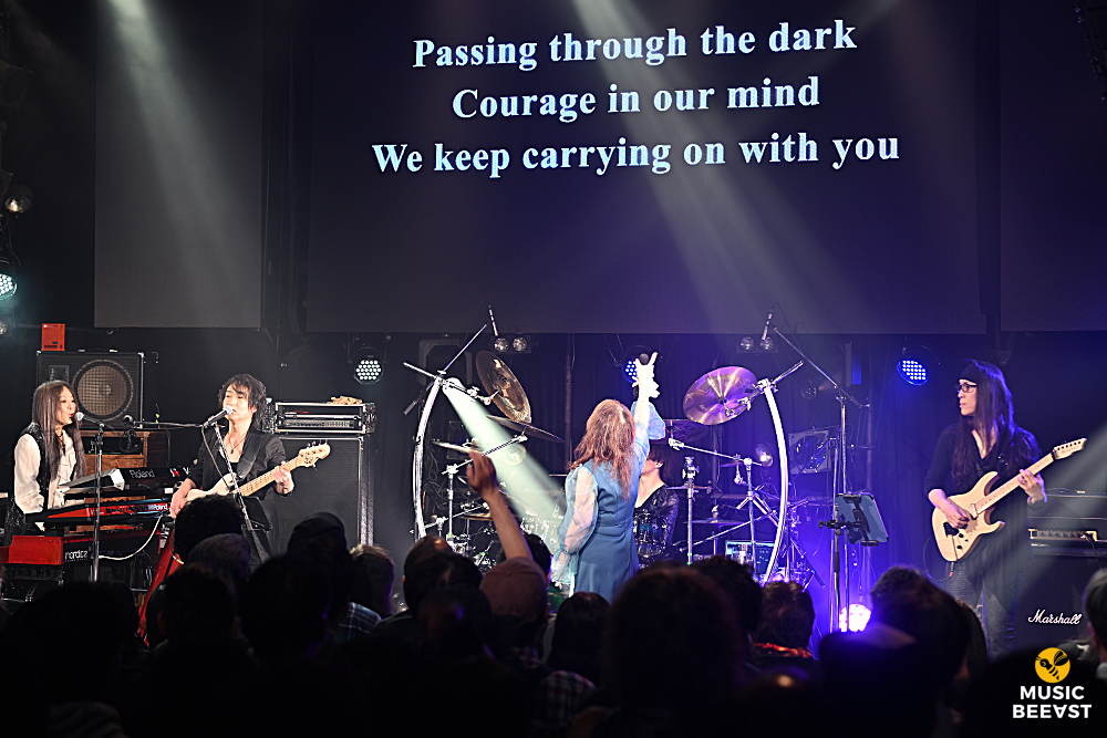暗転した場内に響き渡るニューアルバムからの「SKYWARD PRAY Chapter1 Requiem For The Tragedy 第一章 〜嘆きへのレクイエム〜」。劇的な組曲である三部構成の「SKYWARD PRAY」の第一章をSEとして、オーディエンスの大歓声の中、メンバーがステージへ現れる。原澤 秀樹(Drums)、YUHKI(Keyboards)、長谷川 淳(Bass)、梶原 稔広(Guitar)、そして世良 純子(Vocals)。