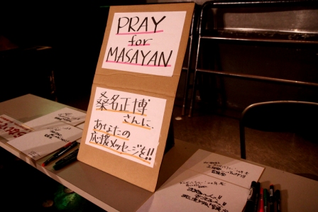 18時30分。開場。ステージのスクリーンにはレコーディングの映像が映し出され、盟友・小田原豊とともに真剣な眼差しで話し合う宮原学の姿が何度もループされる。その映像を見ているだけでも、否応無しにもドキドキとライブへの期待が高まっていく。客席フロアの片隅の物販コーナーにはCDやTシャツが並べられている。その横には、この日のライブの4日前に脳幹出血で倒れ、病の床へ伏せる桑名正博への、励ましのメッセージを書き込むコーナーも設けられていた。