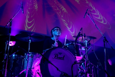 3曲目、4曲目と宮原学らしいビートの効いたロックンロール。ドライブ感をのせたまま、まるで晴れ渡る空に、爽やかな風が抜けていくような軽快でノリのいい曲が続き、思わず拳を上げて一緒に口ずさみたくなる。そこに小田原豊のポップで安定感のある繊細なドラムが加わり、メッケンのベースが、しっかりと軸を作る。