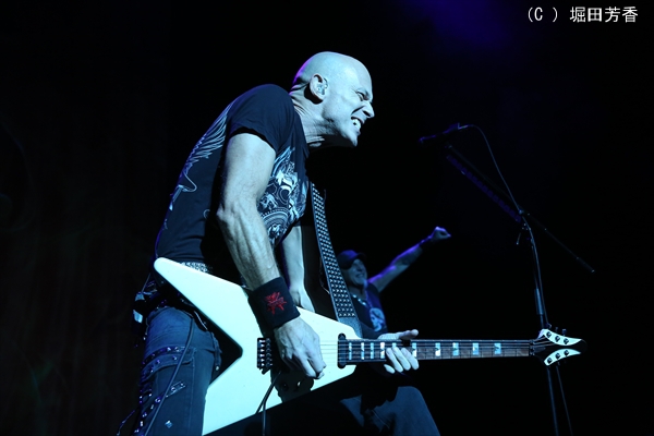 アバンギャルドなウルフのソロが終わると、そのままメロウな「Neon Nights」に続き「Bulletproof」へ。途中に繰り広げられたWolfPeterのバトルは見せどころ、聴かせどころたっぷり。時にはMarkがフロアとコール&レスポンスを楽しんだかと思えば、次の瞬間はWolfがギター・プレイで会場を熱狂の渦に包み込む。そして今度はPeter。「Princess of The Dawn」に続いてベースのソロ・タイムとなり、テクニカルなパッセージをプレイしては、観衆の興奮をさらにあおっていく。「I remember long time ago Tokyo! So,let me hear you again!」彼の言葉とともにパッセージは、強烈なドライブ感を見せ、クライマックスへの序章を奏でる。やがでベースによるコード・プレイから再び曲に戻り、Wolfがそのセカンドメロディを奏でると、そのメロディに合わせ観衆が再び分厚いコーラスを口ずさみはじめた。途中でステージがぴたりと演奏を辞めても、さらに歌い続ける観衆。「Louder!」Markの叫びに、さらに声を荒げる観衆。