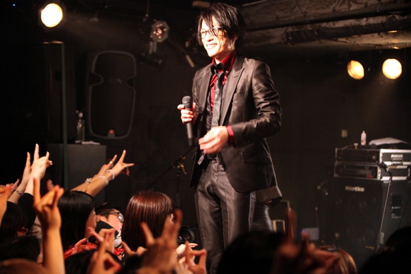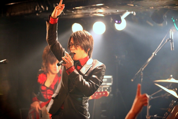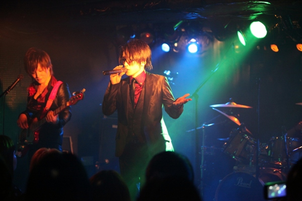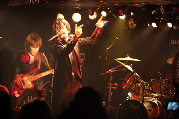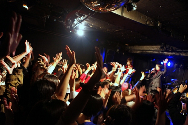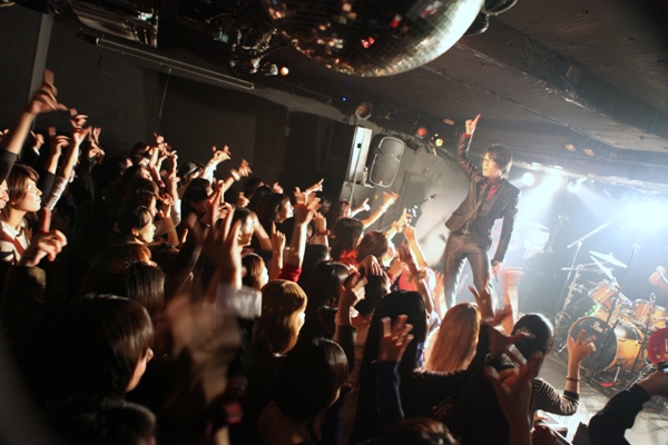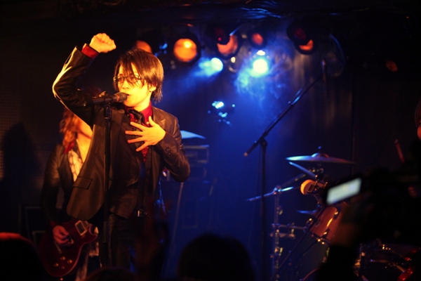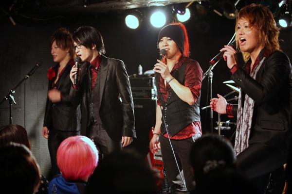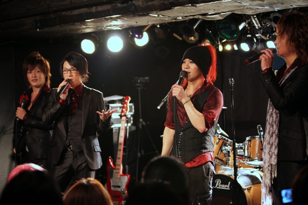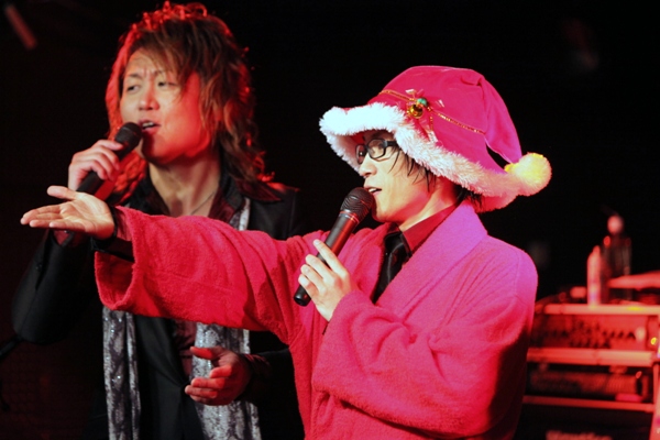流れてくる往年の歌謡曲と共に、開始を待ちわびるオーディエンス。…と、幻想的なワルツに乗って優雅にメンバーがお目見え。待ちわびていたオーディエンスが熱のこもったクラップでお出迎えすると、「ミラクル☆パワー」でライブはスタート。ジンの歌声が脳天を突き抜けるように場内を駆け巡り、オーディエンスの体をゆさぶる。「素敵ロマンス」で会場の温度をもっと上げたと思うと、なんとノブが、冒頭でジンがマイクを忘れてしまったことを暴露。ジンは「ドジッ子ジンです」とクールに(?)決め、ハプニングもパフォーマンスにしてオーディエンスを萌え上がらせる。