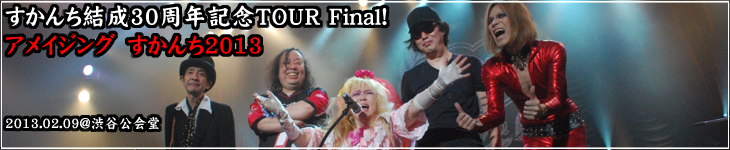 2012年10月27日に東京・赤坂ブリッツで、筋肉少女帯をゲストに迎えて華々しくスタートした、すかんち結成30周年ツアー。札幌・仙台・名古屋・福岡・大阪の全国5都市を巡って、ついにここ渋谷公会堂(以下:渋公)でツアーを締めくくった。17年ぶりに帰ってきた舞台には、2009年11月に事故で重症を負って以来、リハビリを続けるShima-changも参加。すかんちの歴史に残る、感動のワンマンライブの模様をレポート!