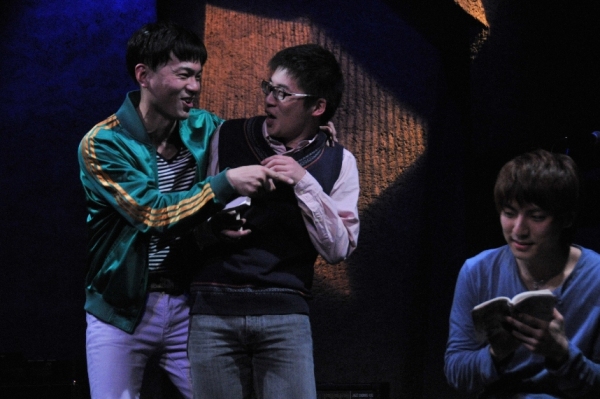 舞台からバンドメンバーが去り、代わって登場するのは、奏の高校時代の友人、中平(西山宏幸)と柴田(須貝英)だ。2人は文庫本を読みふける奏と軽妙に言葉を交わす。奏は本を読みながら、シーンごとにどんな音楽が流れているか想像しているのだと、楽しげに語る。観客がコミカルなこの会話が実は奏の妄想らしいと気づくのは、奏の2番目の兄・楽(岡田達也)と音也が現れ、友2人が表情を無くして舞台袖に下がった時だ。現実では、兄たちが、聴力を無くした弟の身を案じてそれぞれの想いをぶつけ合っている。