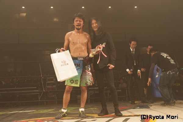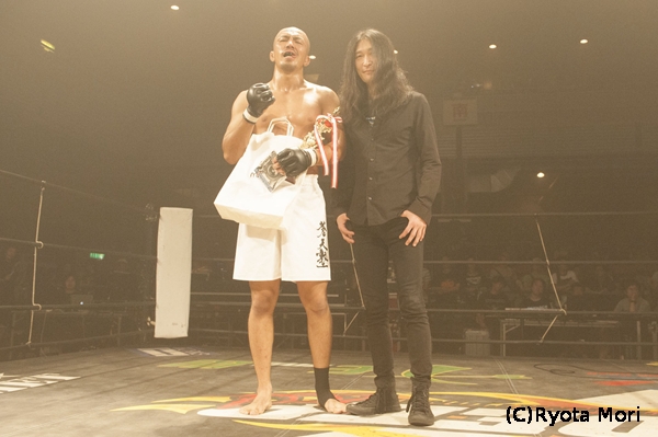 単にエンターテインメントとして共通するものがある、という先日のイヴェントで受けた所感以上に、実際にファイトを目前にすると、選手達の戦う姿から垣間見られるアーティスティックな様子により、リングの上から注意をそらせられなくなってしまう。勝つために燃やす闘志と、反して勝つために巡らせるクールな策略。さらには反則を急所に受けながら、急速に落ちていくモチベーションと必死に戦う様子など、彼らもアーティストの一人であると実感られた。「選手たちに拍手をお願いいたします!」トロフィーの授与を行った丹下が、締めに言葉で観衆に語り掛け、多くの賞賛を浴びさせた。
