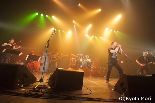 クラッシック奏者の2人は、見慣れないその光景に唖然としながらも、その暖かさすら感じる好意に好感を覚え、OUTRAGEとともに情感豊かなメロディを奏でた。このハーモニーの中でも映えて聴こえる橋本のメロディには、やはり彼のヴォーカリストとしてのただならぬセンスが感じられた。また、常に土台役に徹していた安井がここでは聴かせどころたっぷりのベースソロを披露、熱気が充満した会場に程よいインターバルを与えていた。