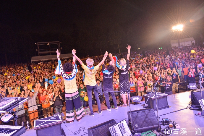 17時30分、一曲目「Four Guys From Saitama City」で、ライブの幕が開く。全員総立ちの会場からは、テンションが上がっているのが手に取るように伝わる。メンバーも会場の熱気に応えるように、パフォーマンスを加速させていく。