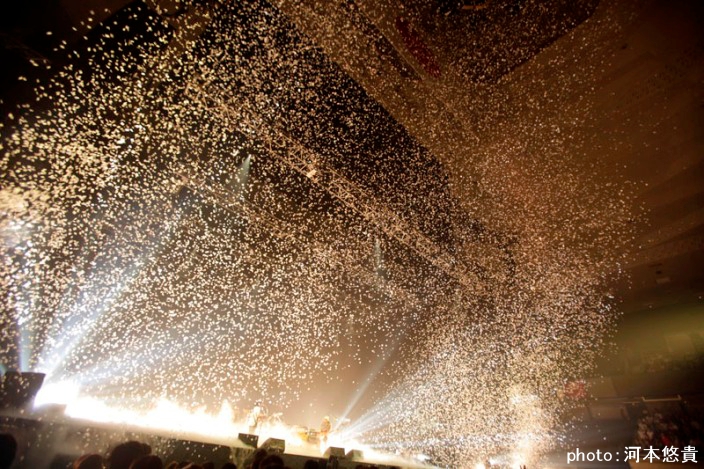 この曲は普段残響で終わるのだが、この日はインストゥルメンタル曲をセッションし始める。一転して明るいフレーズが心地良く聴こえる。それはまるで死から生へ。そして生から死へとの輪廻のようなものを感じる。最後に紙吹雪が舞い、約2か月に及ぶ『新世界』のツアーは幕を閉じた。