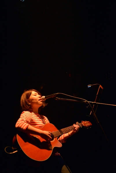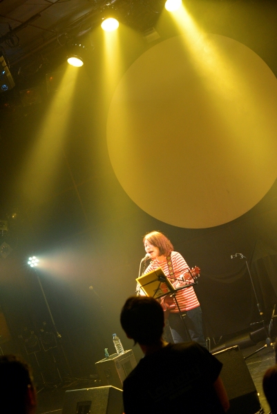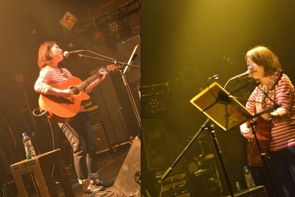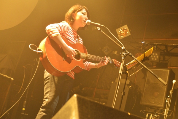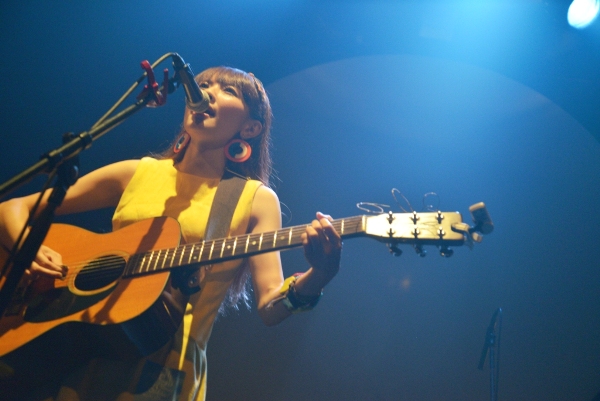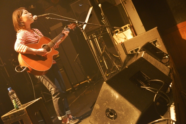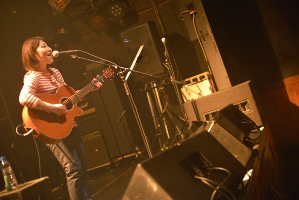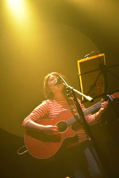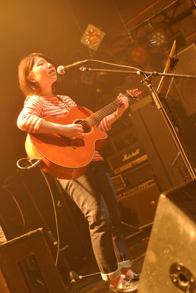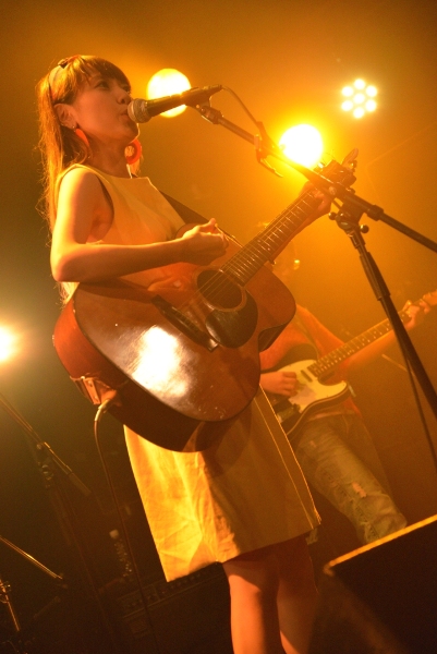 続いてアコースティックギターを抱え登場するのは神奈川出身の女性シンガーソングライター関取花。CHEESE CAKE、The SALOVERS、ズットズレテルズ、挫・人間らとともにファイナル進出した「閃光ライオット2009」では審査員特別賞を受賞し、翌2010年にはミニアルバム『THE』をリリースし、全国ツアーを敢行。2011年にミニアルバム『中くらいの話』をリリース。同年、神戸女子大学のTVCMに「むすめ」が起用され話題となっている。バンドスタイルでライブ出演することもあるが、今宵は一人での弾き語りだ。