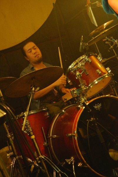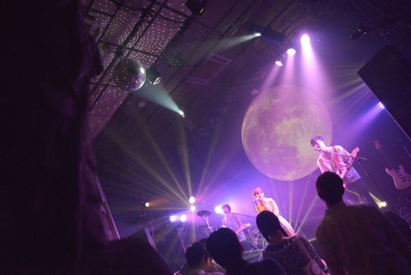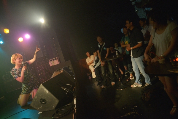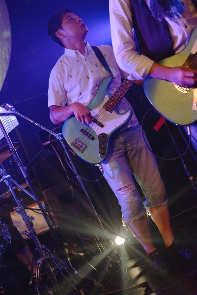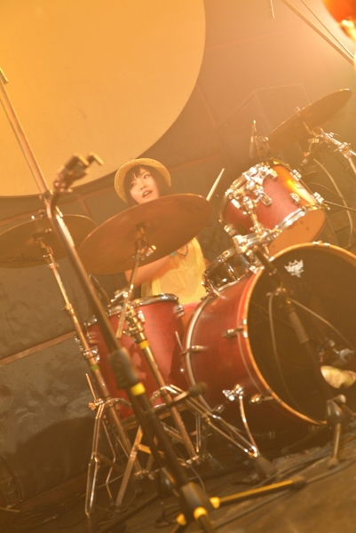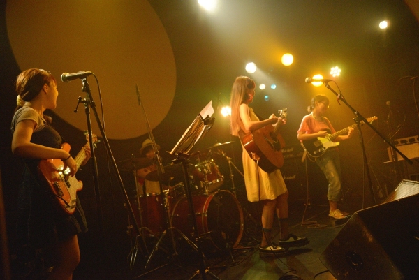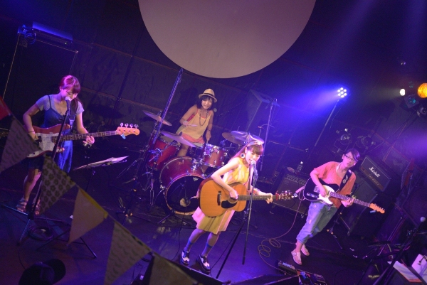 午後6時半、フロアが徐々に埋まってきた頃、Saku(Vocal & Guitar)、まなたん(Guitar)、おかぴー(Bass)、せっちゃん(Drums)の4人がセッティング。いよいよライブが始まる!1組目はSakuバンド。トップバッターらしく「走る少女!!」「Start!!」と立て続けに爽やかなサマーバケーションを感じさせると、「最近月が綺麗で…」と、3曲目はこのステージにぴったりの「ブルームーン」。Sakuが切なく流麗なアコギの旋律を響かせ、まなたんのエレキも静かに寄り添う。一気に空気を作っていくSakuバンド。3ヶ月前の初ライブ(参照:Dream Pygmy 1st Event~Sakuバンド初ライブ~)から比べても4人のグルーヴの高まりを感じる。