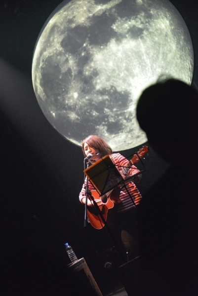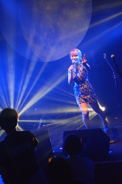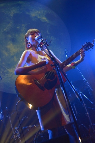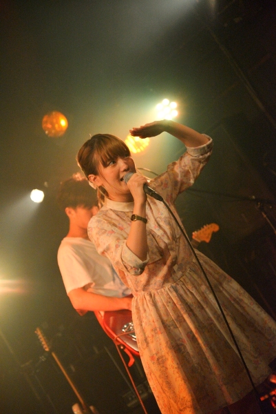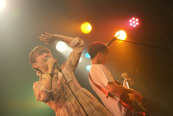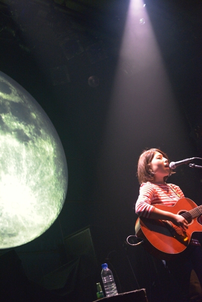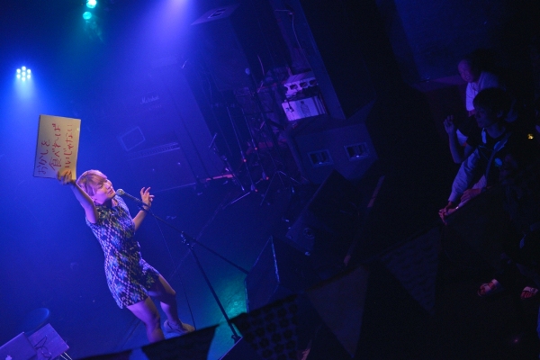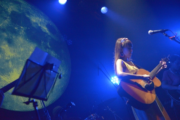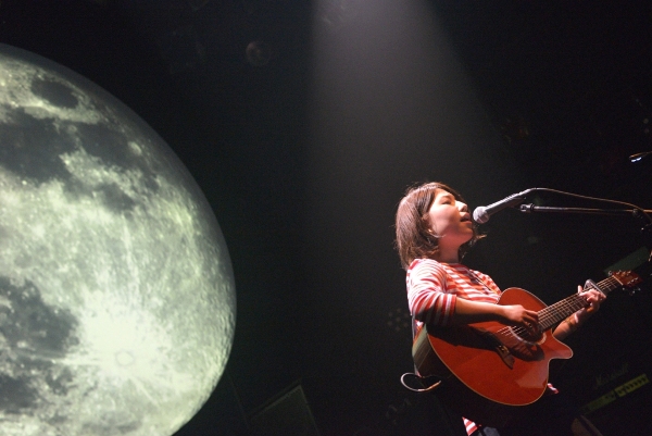 決してじゃかじゃかかき鳴らすことはなく、アコギの音は控えめにそっと添える。1曲目は今年の神戸女子大学のCMソングにも起用されている、スローテンポな「最後の青」をしっとりと歌い上げる。背景の月も曲のイメージにぴったりと合わさり、ムード満点。「こんばんは。お相撲さんの関取に、野に咲く花と書いて、関取花で本名です」ハートフルなMCでなごませつつ、「ガーリーな今日のライブに合わせて初恋の歌を…」と2曲目「はつ恋」で瑞々しい歌声を披露。かと思えば3曲目「ラッターネ」は快調なテンポ、5曲目「めんどくさいのうた」はサビでガツンとくる歌詞。まるでおもちゃ箱のように次々繰り出される関取花ワールドの持ち札の多さにハッとして、グッときた。