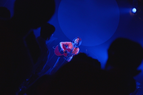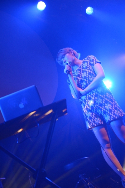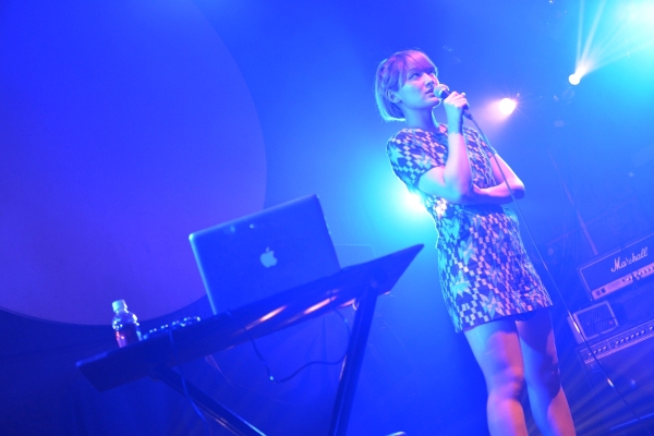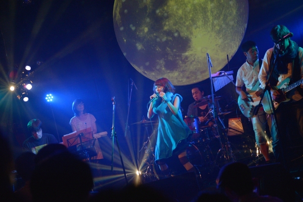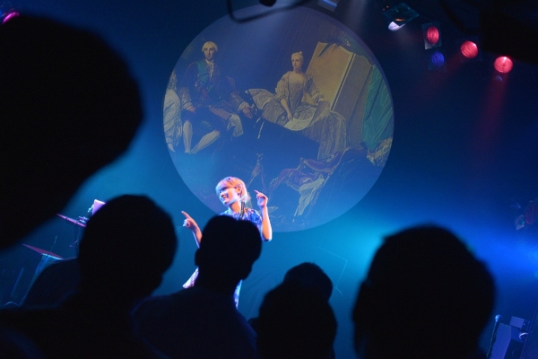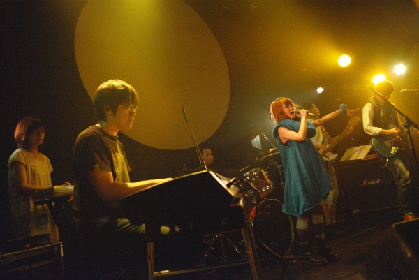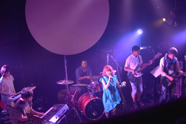 続く2組目はblue marble。ショック太郎、とんCHANの2名が主に楽曲制作を手がけ、武井麻里子(Vocal)も作詞を行う、3人組ポップバンドだ。今宵はサポートメンバーを加えた6人編成での演奏となり、大所帯のステージ。ブルーの衣装に身を包んだ武井麻里子は普段サロンモデルも務めているだけあって、彼女の登場とともにステージはグッと華やかになる。鍵盤2台のゴージャスな音に乗せて、キュートで透き通る歌声を響かせる。
