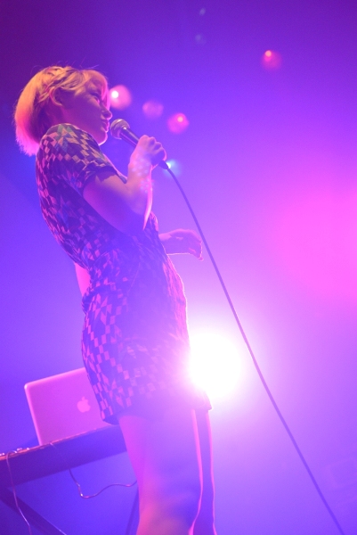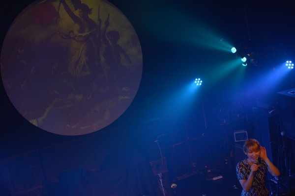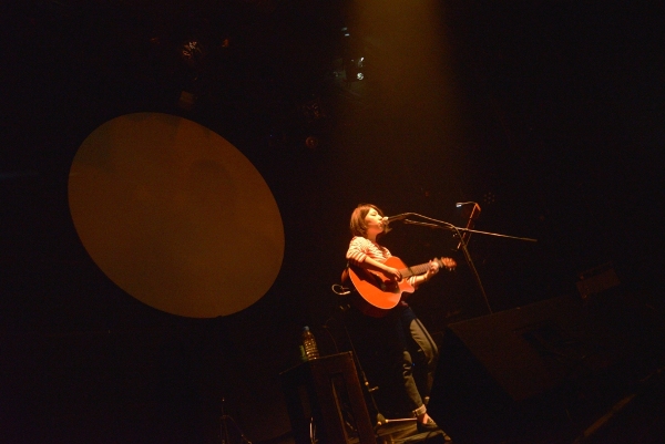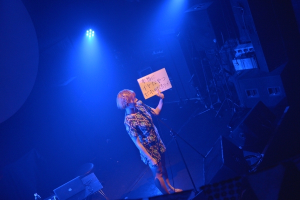 静かなピアノのサウンドに合わせて、透明感あふれるボーカル。1曲目は「パフ」。「今日は5曲くらいやろうと思うので…」自由なMCでふっと緊張の壁が消失、温かい観客の目線が注がれる。2曲目「お七」、3曲目「マリーアントワネット」と、セリフのようなボーカルが続く。「天和師走のある日の夕暮れ 江戸は本郷円乗寺」「マルセイユで暴飲暴食 シャンゼリゼで衝動買い」なんとも不可思議なフレーズの羅列に、なぜか違和感ないサウンドも奏功して一気にその世界観に引き込まれる。「私が楽しかったです」とコムアイ。最後は椅子に座り、8月14日にリリースしたシングル「水曜日のカンパネラdemo3」収録の「シャア」をしっとりと歌い上げた。