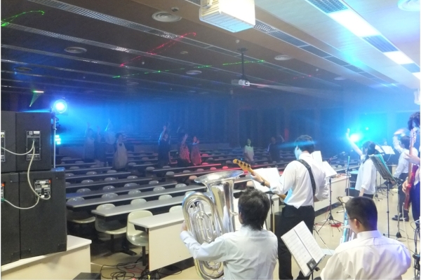 山田:大学である以上当然なのですが、学科も学年も違う学生が集まっての練習ですので、なかなか全員が揃わないのが大変です。合奏練習は、月曜日と金曜日、週に2回ですが、それだけでは個人の演奏力を上げることが出来ませんので、個人練習が重要になってきます。しかし、勉強やアルバイトもしなければならず、なかなか思うように時間が作れないため演奏のクオリティーが上がりません。その辺りのバランスをどのように取るかが苦労します。さらにLiveが近くなると、光での演出やMC、ダンスの振り付けなど、やることが沢山あって大変です。そして会場の設営は、PAや照明機器の設置や調整に3時間近く掛かるので、部員全員の結束が大切です。