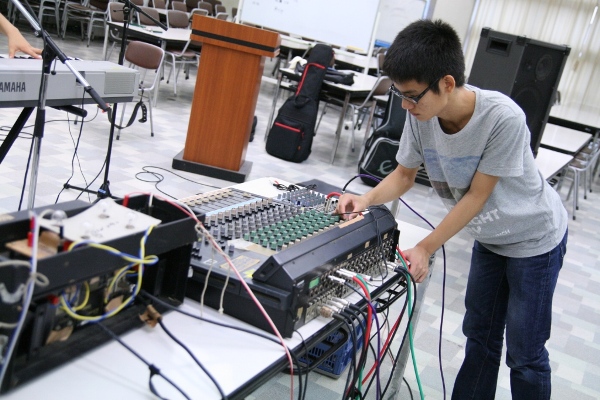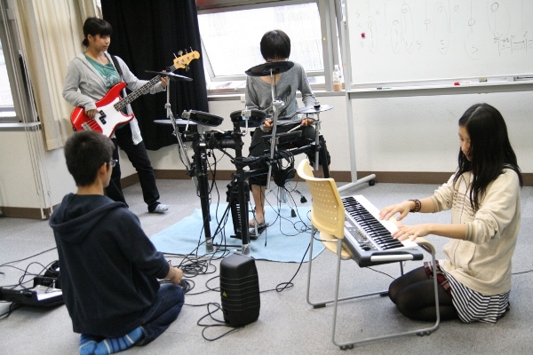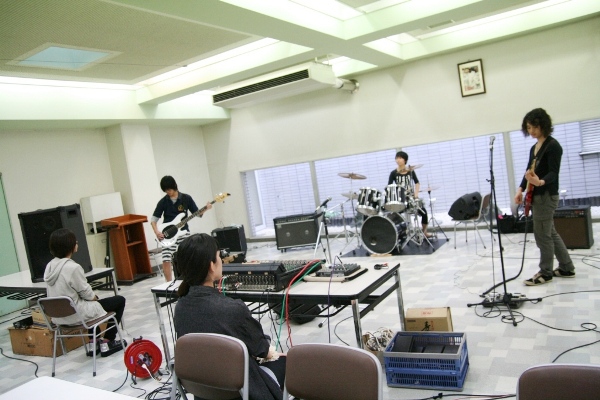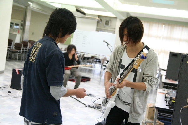 進学校なので平日は講習等の邪魔にならないよう音を下げる。休日も片方のバンドが食堂でコーチの前で演奏する間、もう片方のバンドと個人練習する部員たちは多目的室で演奏。そこではミニアンプにつないだギター、ベースに電子ドラムの即席セット。さらに個人練習メンバーはヘッドフォンを装着しての演奏である。それでも、限られた場所と時間を有効に使いながら、一意専心、真面目にかつ楽しそうに、練習に励んでいた。