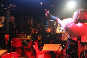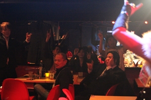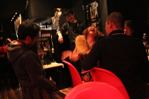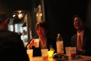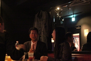 初参加の人、店の常連と人は様々だが、まだお互いを知らぬということで人同士に壁を見せる参加者達。その中に乱入し始めるやいなや、大入袋舞が第一声、「まずは気軽に自己紹介しちゃいましょう!」そして、いつしか自己紹介へ。それぞれのプロフィールにお互い強い関心を持ち、いつしかツッコミが入りだす参加者達。遂には「君、話が長いから次!」等と、親しげな雰囲気が沸きあがる。ふっと気が付いたボトルのラベルには、バーMalmsteenのラベルが。「Malmsteenご用達の商品があるのさ、なんてね!」等と、自然に打ち解けていく参加者一堂。大入袋舞のパワー、侮るなかれ。それにしても、初めて来た参加者でもこんなに楽しい雰囲気に馴染めるなんて、「この機会を逃すのは損ですぜ!」と断言できるほどの盛り上がりが出始める。