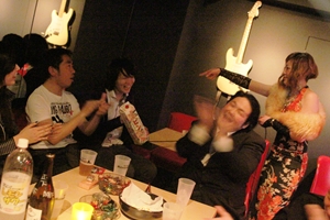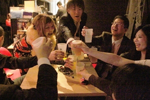 いつしか会話の内容も砕けてきた。「よ~し!じゃあ次は王様ゲームだ!」「ちょっとー!そこ行っちゃいますゥ?」絶妙なタイミングで茶々を入れ、仕舞いには酒を注ぎ始める大入袋舞、恐るべし…思わず酒も進む参加者一堂。開始から約30分、参加者が増えた。一人、また一人。その度に「ラブラブフライデー!!」と、盛大な盛り上がりを見せる。そしてすぐ盛り上がりの中心へ。そんなことお構い無しに大様ゲームをせがむ客と、「早い早い…」とすかさず突っ込みを入れる大入袋舞。なかなかいいコンビネーションが出来上がってきた。「実はバンドやってまして…」「え~本当ですか!?いや~なんかイケメンさんですねぇ!」イケメン風の男性、ホシ氏に絡み始める彼女。それを皮切りに、イケメンコールがホシ氏を包む。その様子に、、テレを見せるホシ氏。この場面は、一つの合コン成功例を見せてくれたかのようだ。合コンの必勝パターンはバンド話、深く心に刻むべし。