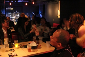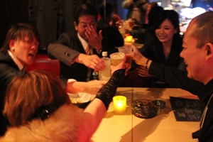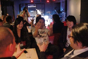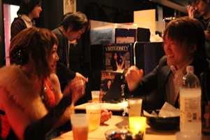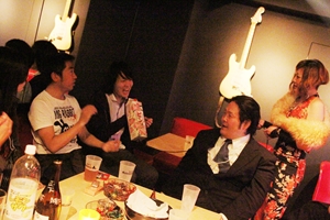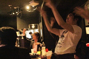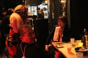 激闘の末、果敢な戦いを繰り広げた両者を讃えるかのような終焉。結果は…両者引き分けというところだろうか。熱のこもったイベントを終え、クールダウンした効果もあるのだろうか、参加者はリラックス・モードに入った。酒の酔いも程よく回り、まるで随分と昔から知り合いの友人同士のような語らいに入る。そこにまた、自らの恥をさらしに…いや、参加者との和を深めるために、再び身を投じる大入袋舞。非常に居心地の良い雰囲気が、そこにはあった。参加者の一人が、ロレツの回らない一言、「逆境を乗り越えていこうね!」それに対し「え~それってプロポーズ!?」大入袋舞のキビしい突っ込み。この展開が、この場最大の見せ場となる、あの時間へのプレリュードとなる…