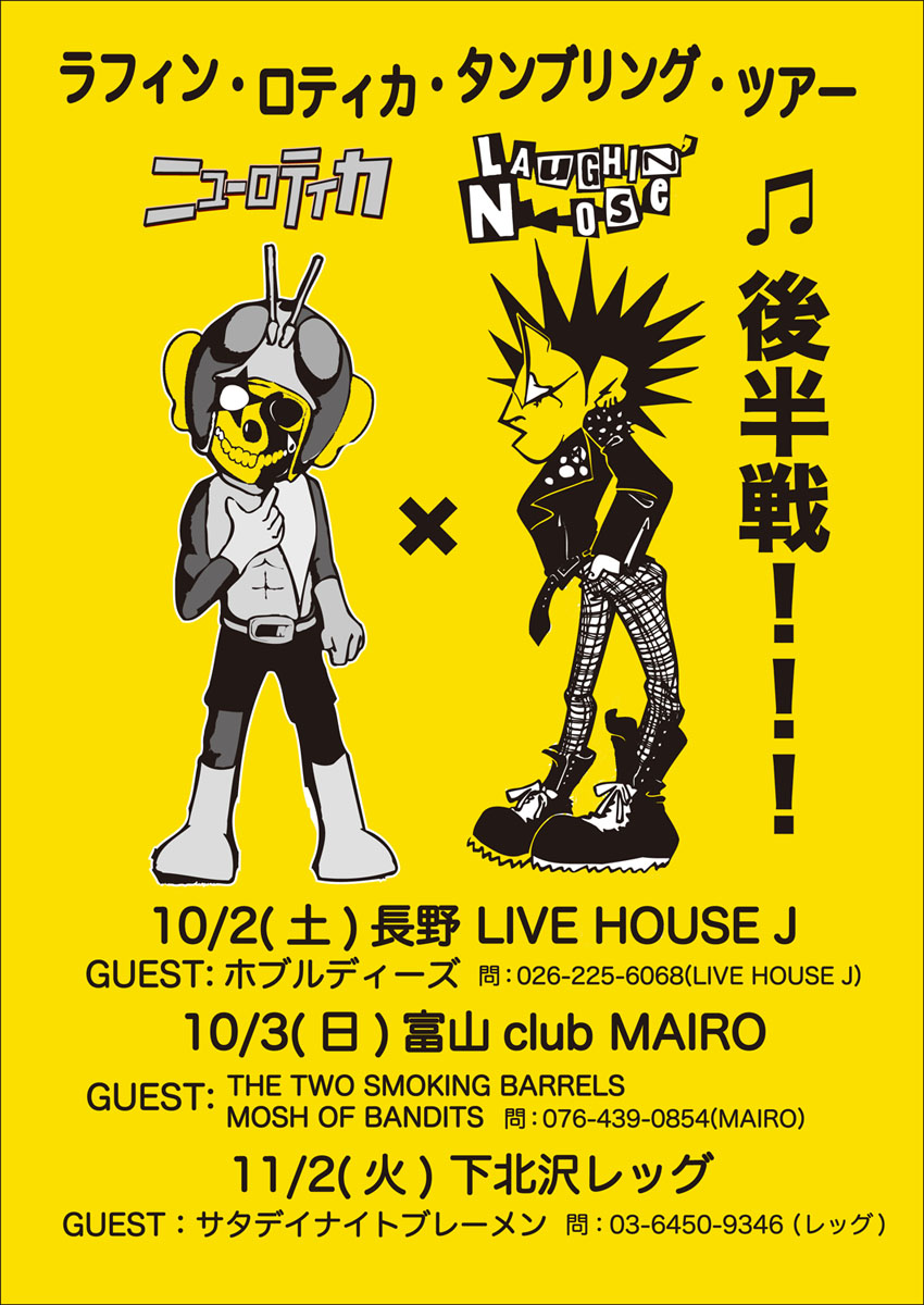 新しいニュースです。LAUGHIN’ NOSEとNEW ROTE’KAのカップリングツアーのライブ情報です。フライヤー画像をクリックすると拡大します。この組み合わせは凄く面白いのではないかと思います!ぜひ足を運んでください!10/2の長野公演は飯田も友人を連れて参加したいと思ってます。
